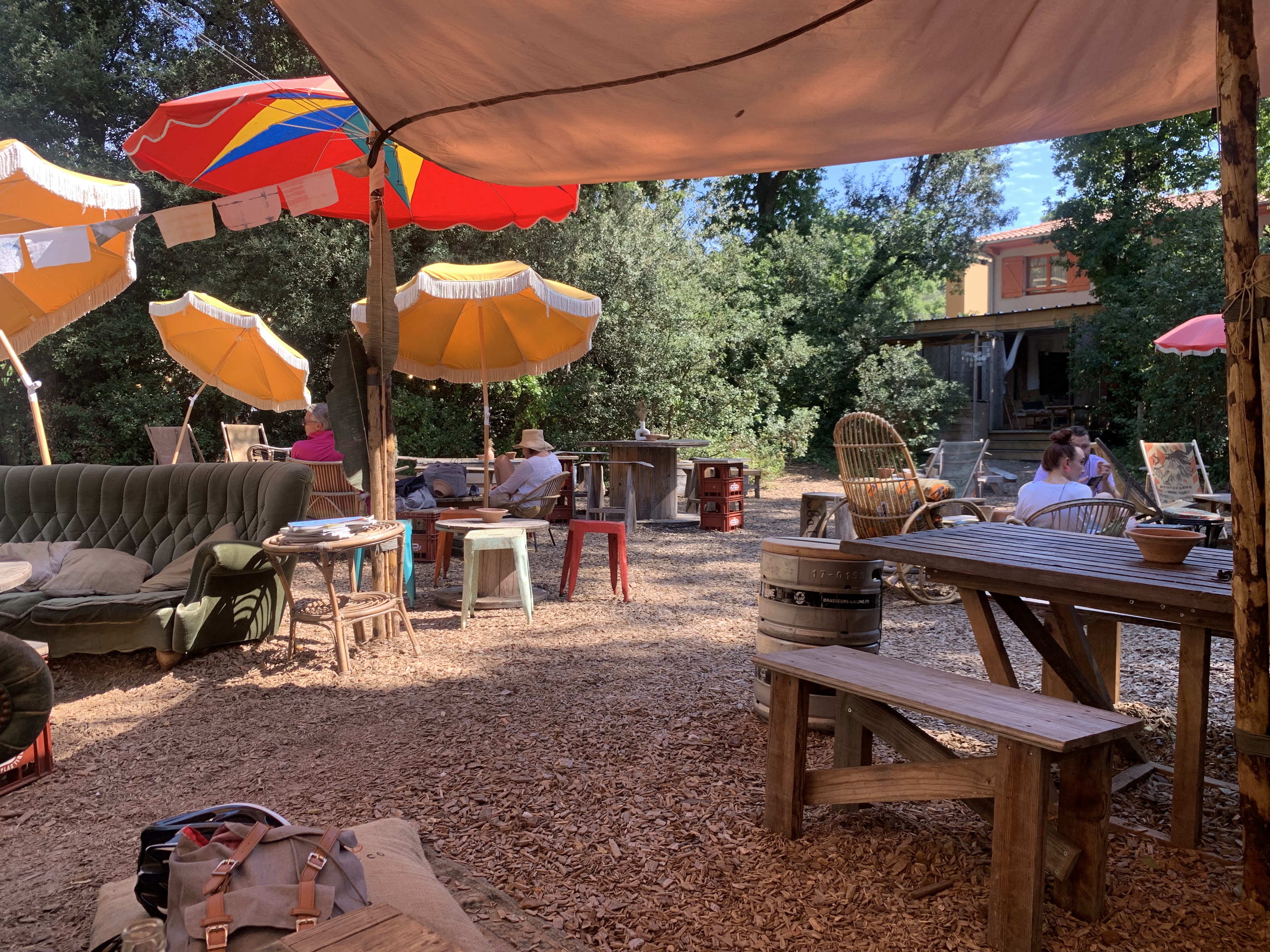 Nous y avons mangé hier midi, pourtant en arrivant à 13:50! Super accueil, proposition de mettre un parasol pour être à l'ombre. Servis très rapidement, la carte est végé et bio. On a pris les burgers frites et salade tomate burrata, tout était excellent et copieux. Les bières à la pression sont d'une micro brasserie de Bordeaux et sont très bonnes. Le lieu est génial, caché dans les arbres, tout est fait en récup et bois! Serveuses très sympas, je recommande !