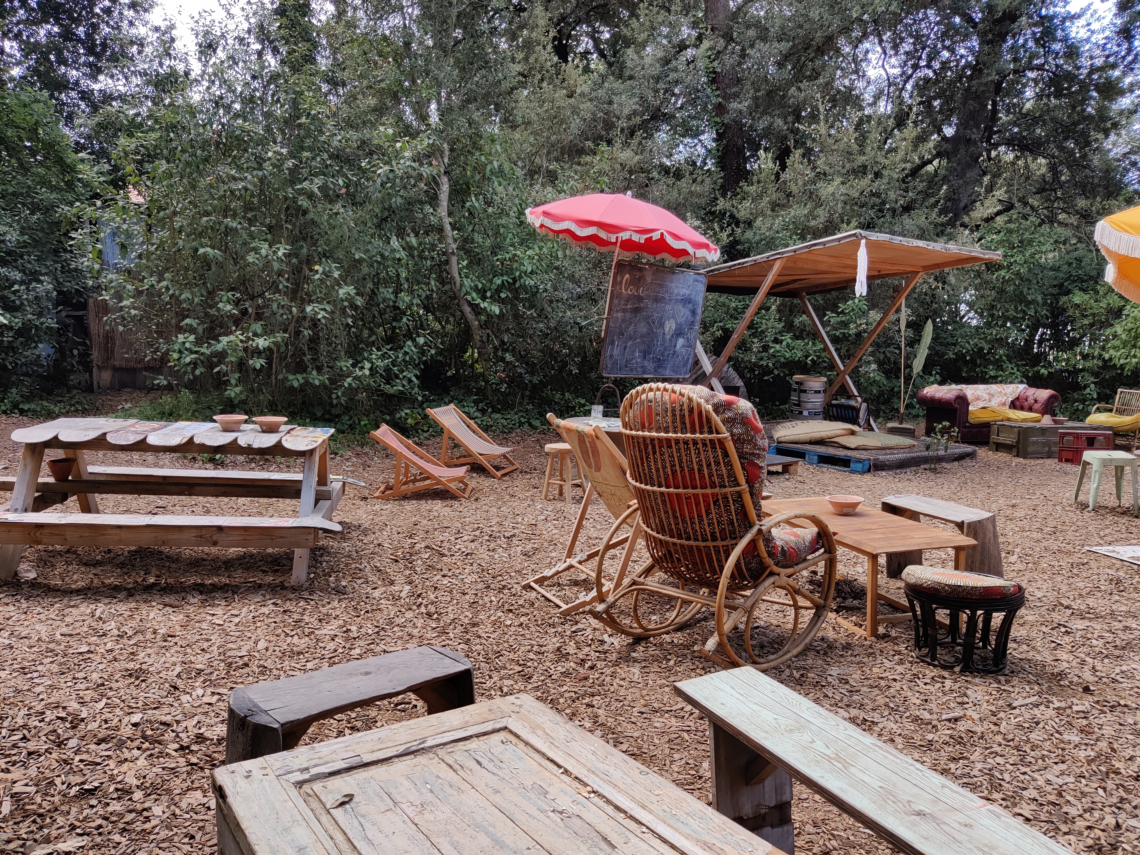Quelques tables nichées au milieu d’une végétation luxuriante ! Vraiment très agréable! L équipe est tres sympa! On aurait bien aimé un peu plus de choix pour grignoter pour y passer plus de temps! Déco récup très tendance 😉