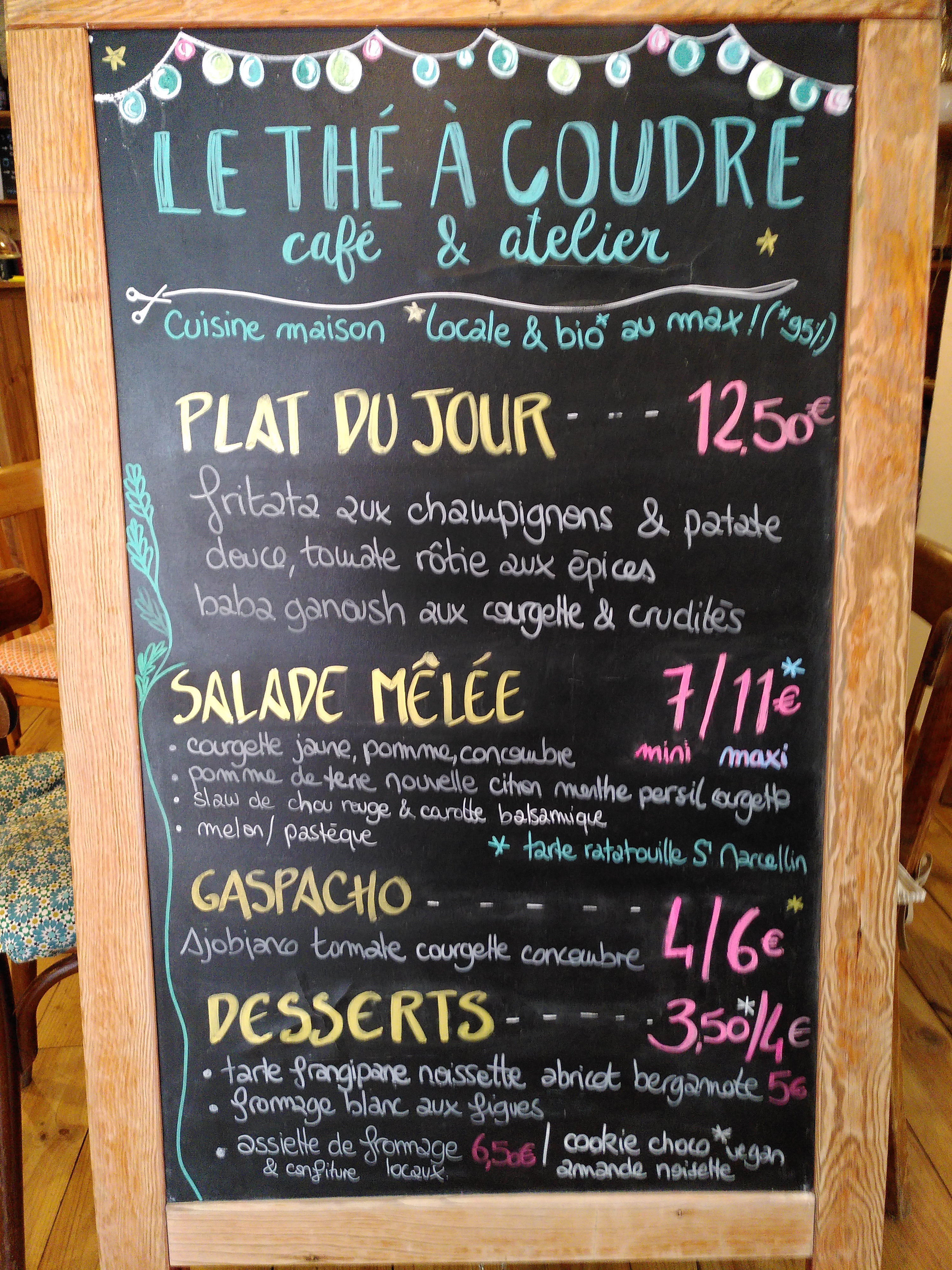 Posté le 25/09/2019 à 14:09"Très joli café couture, on y a bien mangé (soupe délicieuse) et il y règne une ambiance calme, bienveillante, un esprit bohème tout à fait agréable. J'ai discuté avec une des patronnes, très sympa, mais je ne connais son prénom :-( Enfin, un chouette endroit, comme il devrait en exister plus!"