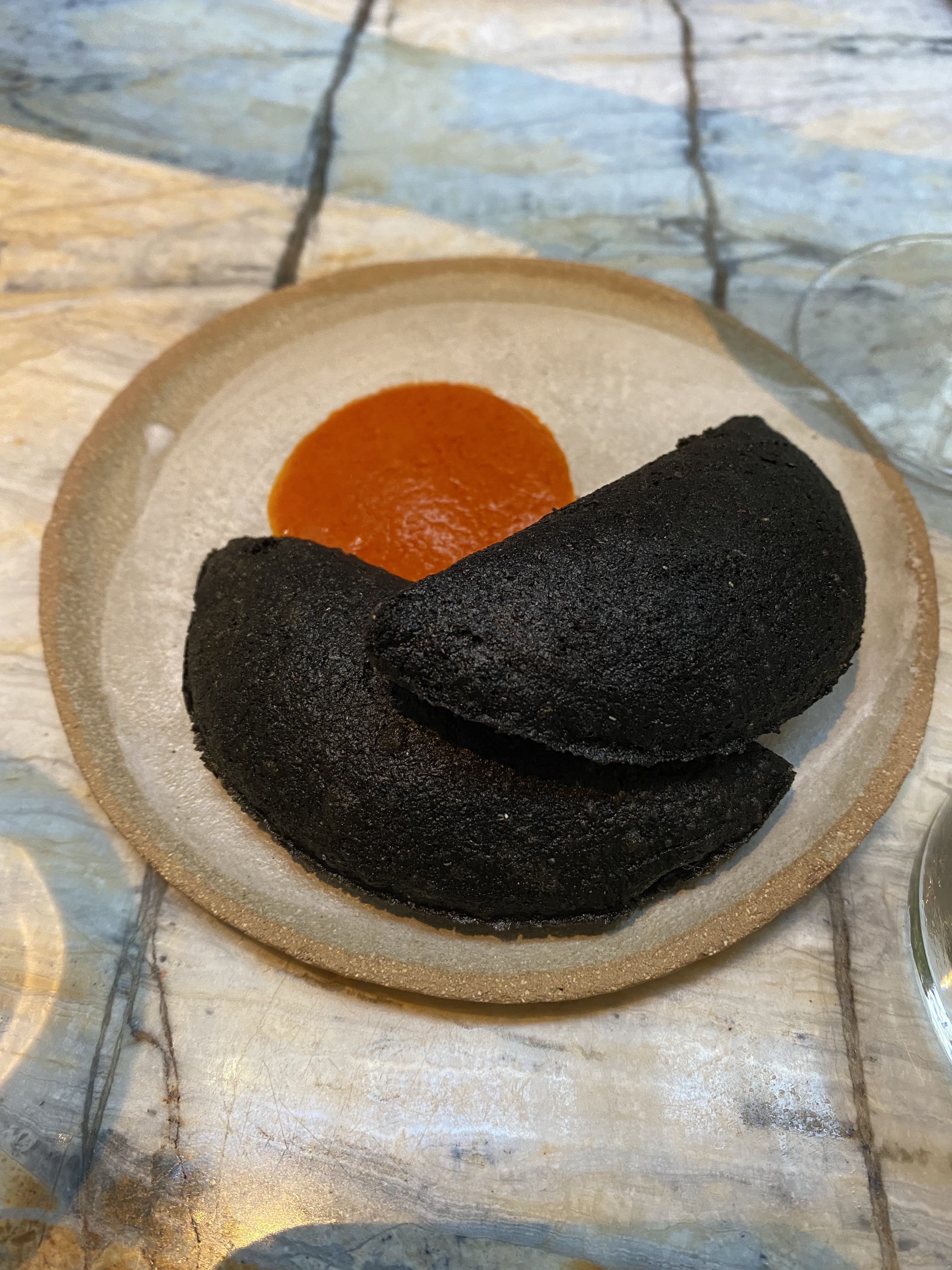 Posté le 02/09/2024 à 18:29" La nourriture ici était absolument incroyable. Nous avons partagé la crudité et la trempette aux herbes, ce qui était délicieux. Mon ami a eu le consommé de légumes rôtis et j'ai eu la tortilla de maïs avec avocat et salsa macha, et honnêtement, c'était l'une des choses les plus merveilleuses que j'ai mangées récemment. Cela m'a rendu tellement heureux. La serveuse était très sympathique et gentille et les vins étaient excellents. Je veux revenir pour essayer le reste maintenant. "