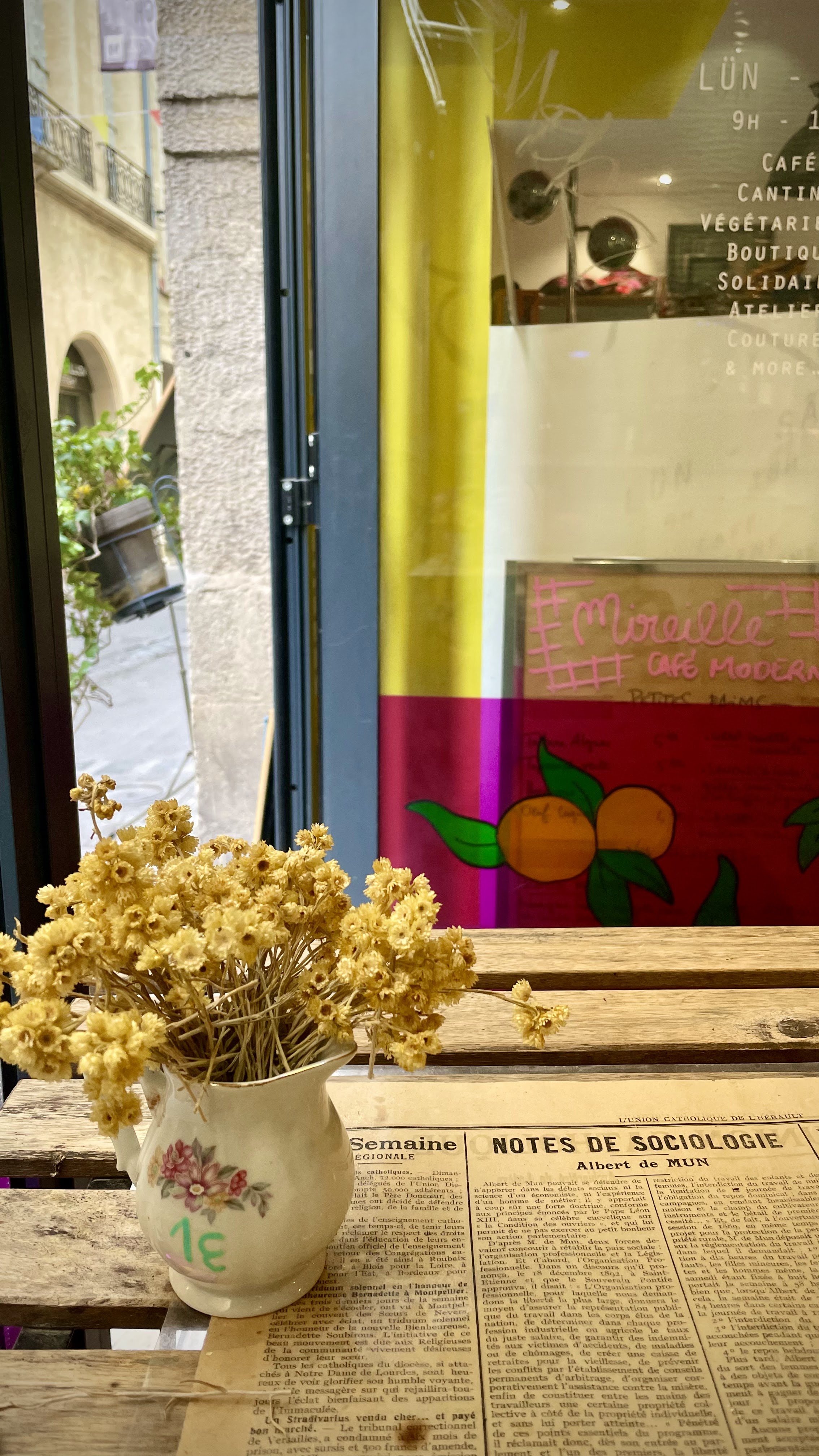 Délicieux moment chez Mireille avec un déjeuner savoureux sous les arbres de la place. Et il est impossible de repartir les mains vides de la friperie solidaire installée dans la boutique. Mireille a vraiment crée un café moderne où il fait bon s’arrêter et revenir !