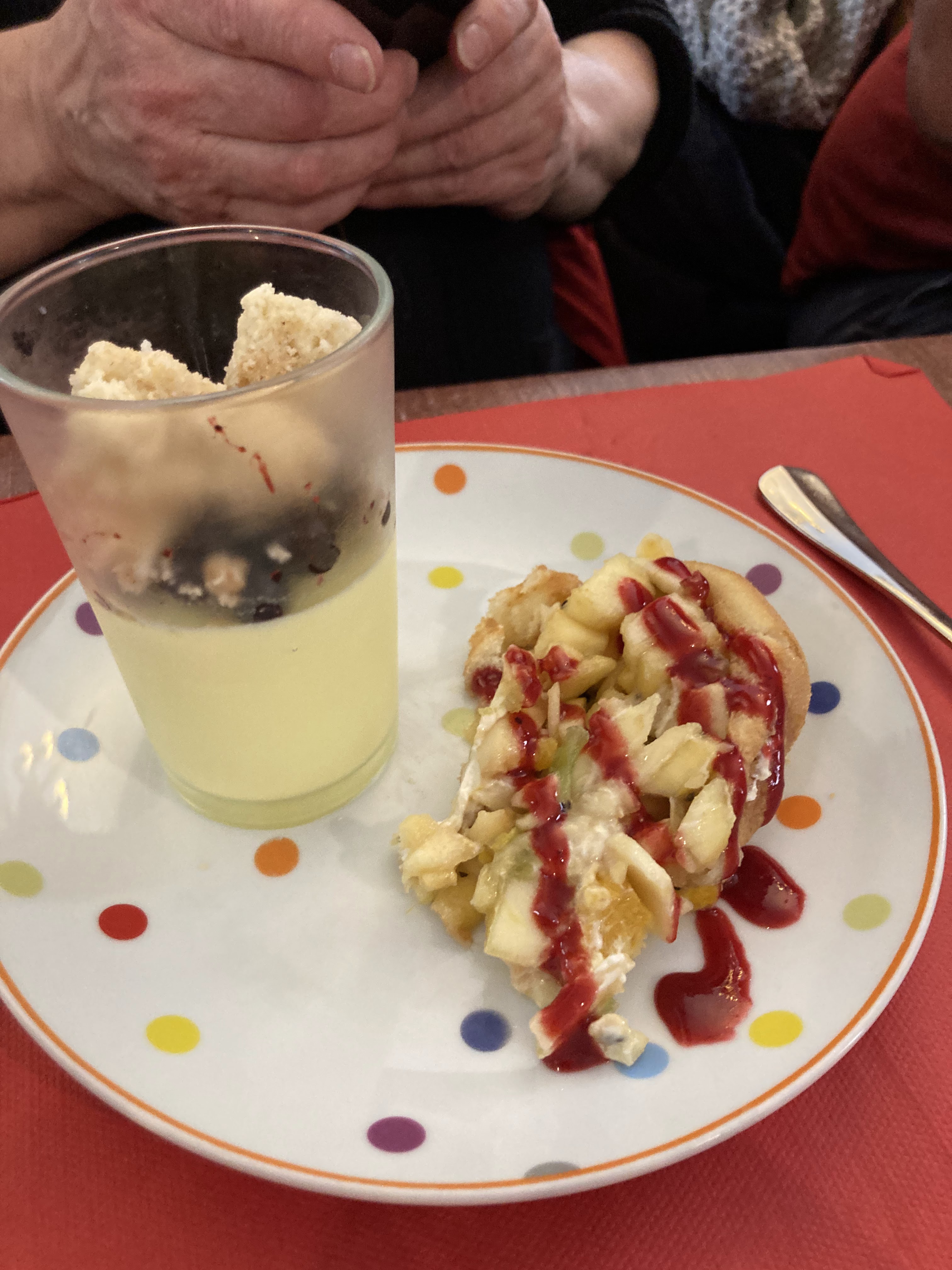 "Malgré un plat du jour épuisé, nous avons eu droit a une très belle et bonne salade ( un mix des entrées proposées) et pour le dessert possibilité de mixer 2 desserts au choix. La charlotte aux fruits frais est excellente! Personnel très sympathique."