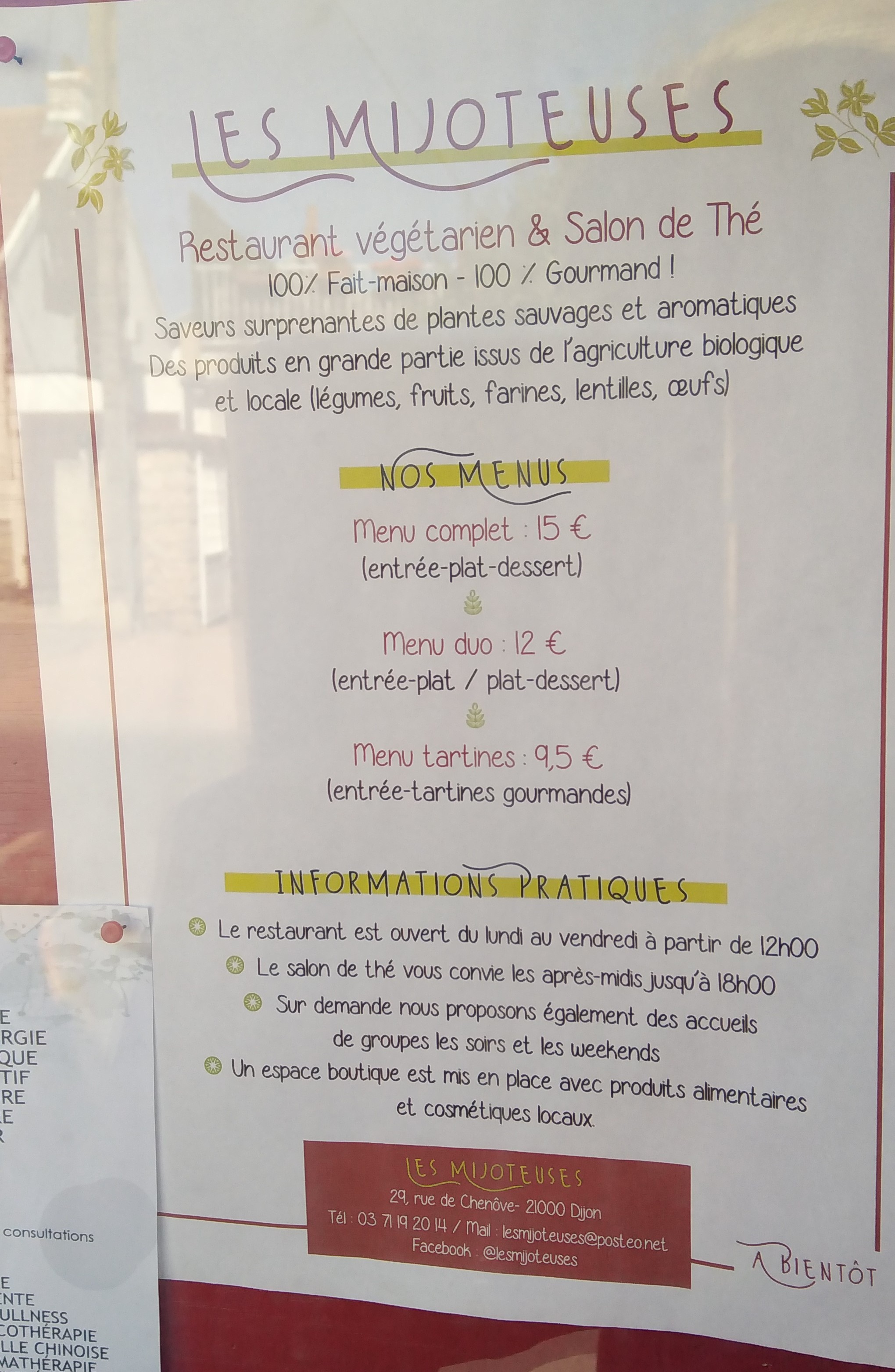 Découvrez toutes les informations concernant Restaurant végétarien Restaurant Végétarien Les Mijoteuses qui se situe au 29 Rue de Chenôve, 21000 Dijon (21). Cette fiche inclut les photos, les horaires d'ouverture, l'adresse, le numéro de téléphone et les avis des clients.
